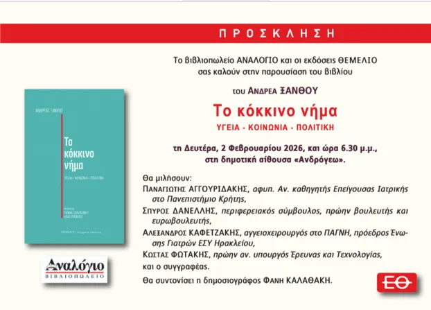 Το βιβλίο του Ανδρέα Ξανθού με τίτλο «Το κόκκινο νήμα – Υγεία, Κοινωνία, Πολιτική» παρουσιάζεται τη Δευτέρα 2 Φεβρουαρίου 2026, στις 6.30 μ.μ., στη δημοτική αίθουσα “Ανδρόγεω” στο Ηράκλειο.