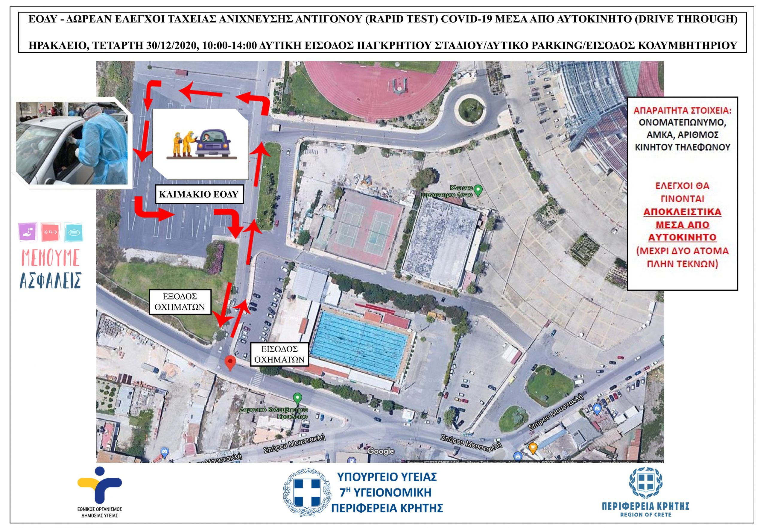 Έλεγχοι ταχείας ανίχνευσης αντιγόνου Covid-19 (rapid test) μέσα από αυτοκίνητο (drive through) θα πραγματοποιηθούν την Τετάρτη 30/12/2020 από κλιμάκιο του ΕΟΔΥ στο Ηράκλειο.