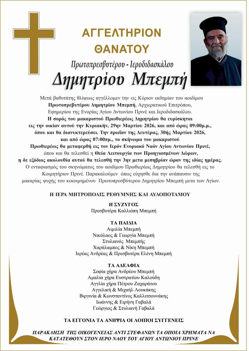 ΚΡΗΤΗΡΕΘΥΜΝΟ Ρέθυμνο:Αγγελτήριον θανάτου Πρωτοπρεσβυτέρου-Ιεροδιδασκάλου Δημητρίου Μπεμπή Από: Team Πολ. Κρήτης Ημερομηνία: 28/03/2026 TagsΑγγελτήριον θανάτουΔημητρίου ΜπεμπήΙεροδιδασκάλουΠρωτοπρεσβυτέρου Προηγούμενο Άρθροplaceholder text Επόμενο Άρθροplaceholder text Ρέθυμνο: Πρωτοποριακή επέμβαση στη χειρουργική κλινική του... 1 ώρα ago 0 Μια πρωτοποριακή και ταυτόχρονα και εκπαιδευτικού χαρακτήρα επέμβαση ολοκληρώθηκε... Χανιά:Αλλαγή σημείου υποδοχής του Νέου Μητροπολίτη Κυδωνίας... 1 ώρα ago 0 Μεταφέρεται λόγω έντονης βροχής το σημείο υποδοχής του νέου... Ρέθυμνο: Πρωτοποριακή επέμβαση στη χειρουργική κλινική του... 1 ώρα ago 0 Μια πρωτοποριακή και ταυτόχρονα και εκπαιδευτικού χαρακτήρα επέμβαση ολοκληρώθηκε... Χανιά:Αλλαγή σημείου υποδοχής του Νέου Μητροπολίτη Κυδωνίας... 1 ώρα ago 0 Μεταφέρεται λόγω έντονης βροχής το σημείο υποδοχής του νέου... Προηγούμενο άρθροΣυνεχίζονται οι εργασίες για την τοποθέτηση κεντρικού αγωγού ύδρευσης σε περιοχές του Ατσαλένιου, νέου Κοιμητηρίου και ΕΛΜΕΠΑ από τη ΔΕΥΑΗΕπόμενο άρθροΧανιά:Αλλαγή σημείου υποδοχής του Νέου Μητροπολίτη Κυδωνίας και Αποκορώνου. Κ. Τίτου λόγω κακοκαιρίας Team Πολ. Κρήτης Share post: FacebookTwitterPinterestWhatsApp SubscribeI want inI've read and accept the Privacy Policy. Popular Ρέθυμνο: Πρωτοποριακή επέμβαση στη χειρουργική κλινική του Νοσοκομείου Ρεθύμνου Χανιά:Αλλαγή σημείου υποδοχής του Νέου Μητροπολίτη Κυδωνίας και Αποκορώνου. Κ. Τίτου λόγω κακοκαιρίας Συνέδριο ΠαΣοΚ 2η ημέρα Βουλιαγμένη: Σήμερα η επιχείρηση ανάσυρσης της σορού του 34χρονου δύτη από το «πηγάδι του Διαβόλου» Συνεχίζονται οι εργασίες για την τοποθέτηση κεντρικού αγωγού ύδρευσης σε περιοχές του Ατσαλένιου, νέου Κοιμητηρίου και ΕΛΜΕΠΑ από τη ΔΕΥΑΗ More like thisRelated Ρέθυμνο: Πρωτοποριακή επέμβαση στη χειρουργική κλινική του Νοσοκομείου Ρεθύμνου Team Πολ. Κρήτης - 28/03/2026 Μια πρωτοποριακή και ταυτόχρονα και εκπαιδευτικού χαρακτήρα επέμβαση ολοκληρώθηκε... Χανιά:Αλλαγή σημείου υποδοχής του Νέου Μητροπολίτη Κυδωνίας και Αποκορώνου. Κ. Τίτου λόγω κακοκαιρίας Team Πολ. Κρήτης - 28/03/2026 Μεταφέρεται λόγω έντονης βροχής το σημείο υποδοχής του νέου... Συνέδριο ΠαΣοΚ 2η ημέρα Team Πολ. Κρήτης - 28/03/2026 Κατά τη διάρκεια της 2ης ημέρας του Συνεδρίου του... Βουλιαγμένη: Σήμερα η επιχείρηση ανάσυρσης της σορού του 34χρονου δύτη από το «πηγάδι του Διαβόλου» Team Πολ. Κρήτης - 28/03/2026 Η ανάσυρση της αναμένεται να διαρκέσει τουλάχιστον 1,5 ώρα...