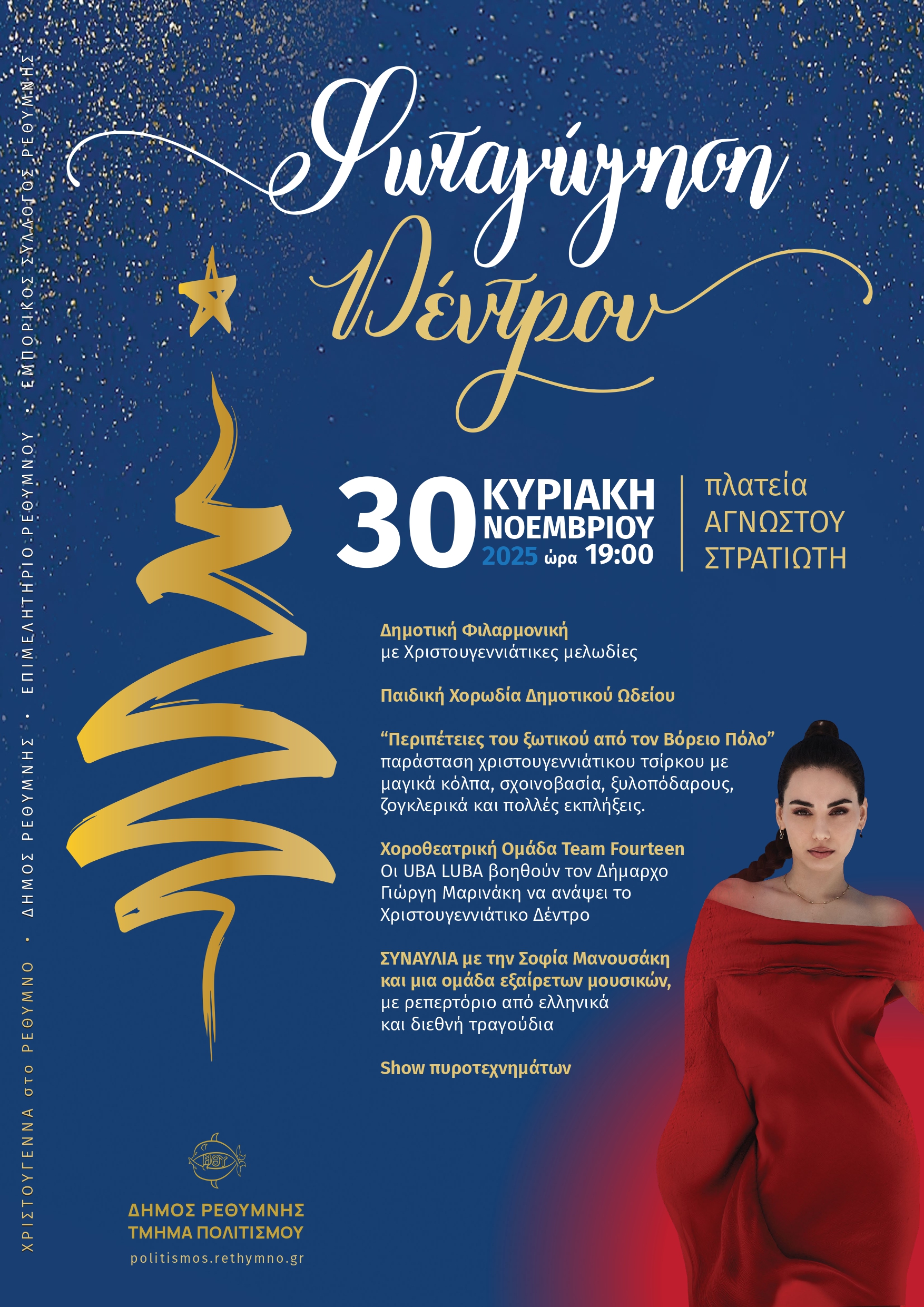 «Με μια γιορτή που θα την πλημμυρίζουν τα πολύχρωμα φώτα, η μουσική, τα τραγούδια και τα εορταστικά δρώμενα, το Ρέθυμνο θα μπει στην φαντασμαγορία των ημερών καλώντας μικρούς και μεγάλους να χαρούν στην πόλη μας ανεπανάληπτες γιορτές» όπως επισημαίνει ο Αντιδήμαρχος Πολιτισμού Δήμου Ρεθύμνης κ. Μάνος Τσακωνας, ο οποίος με τους συνεργάτες του έχουν ετοιμάσει ένα πλούσιο πρόγραμμα εκδηλώσεων.