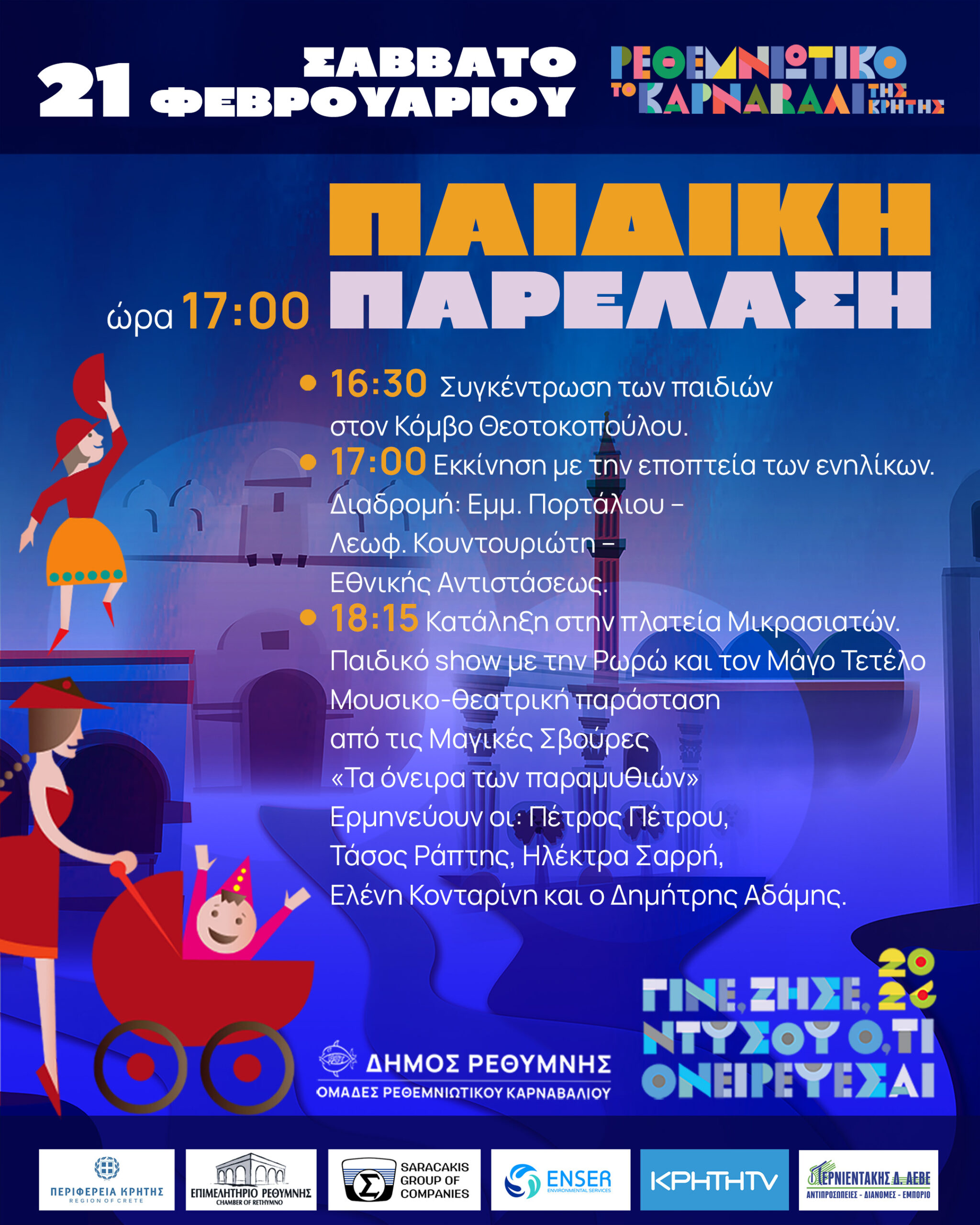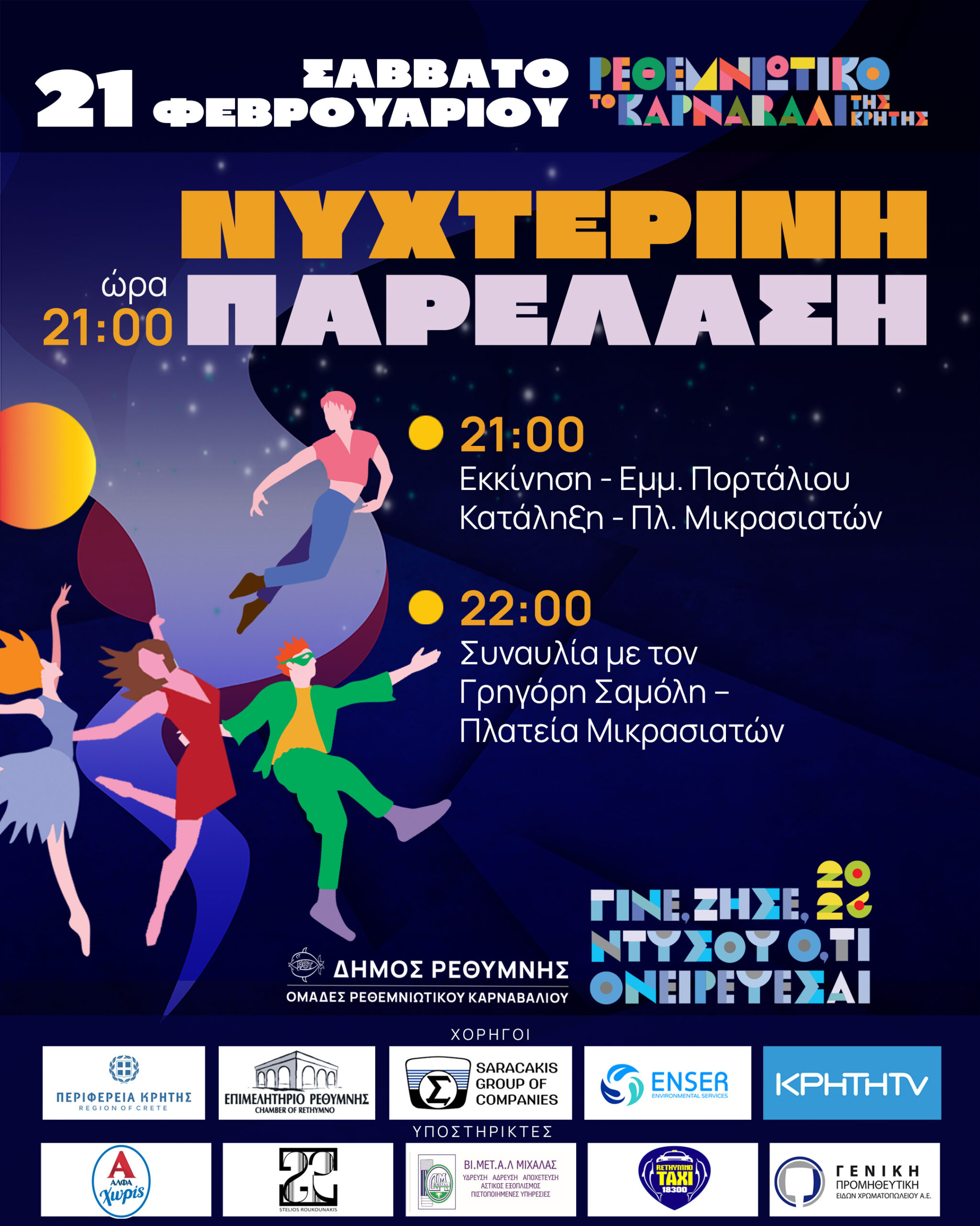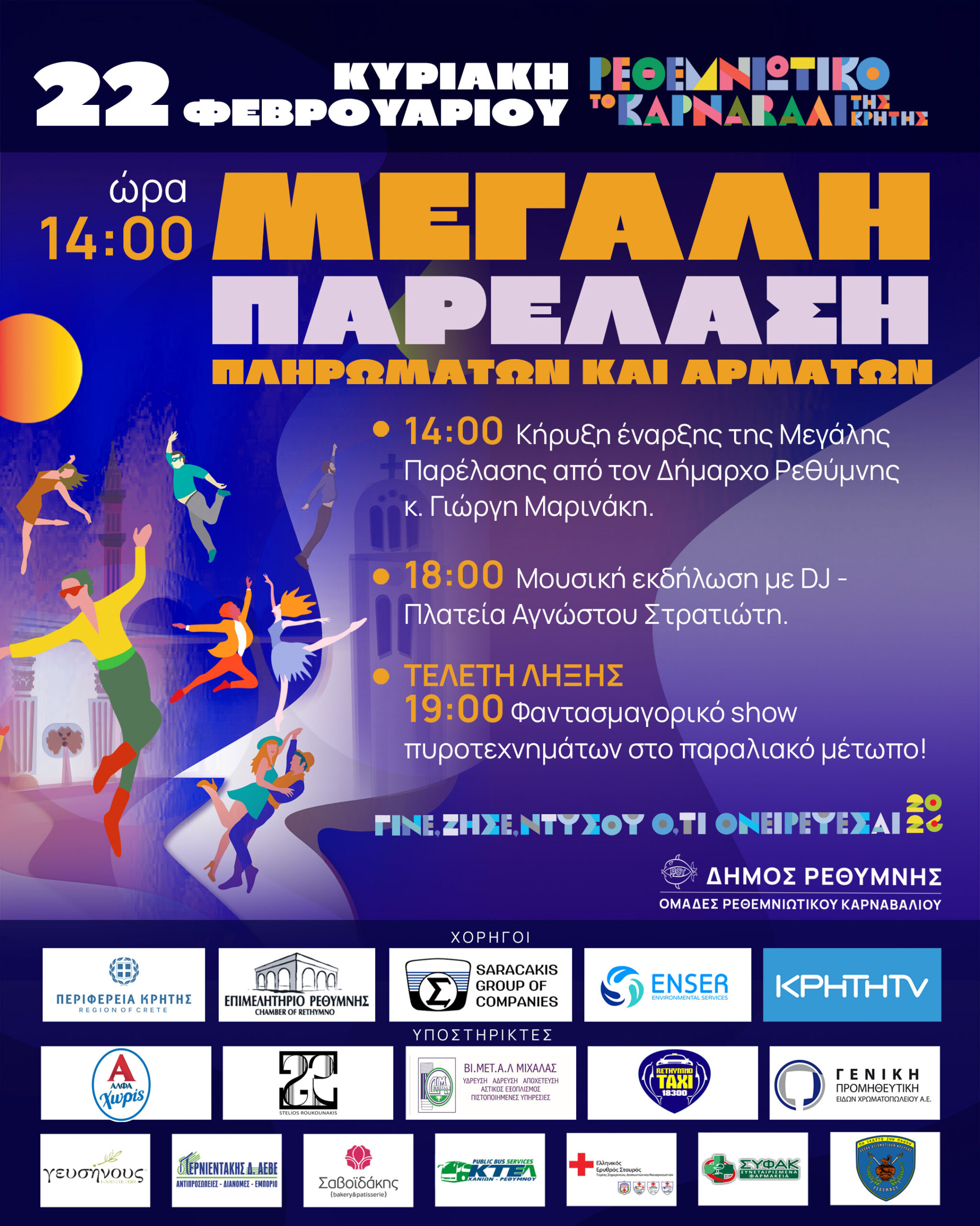 •Εκκίνηση πληρωμάτων και αρμάτων του Ρεθεμνιώτικου Καρναβαλιού 2026 από τον Κόμβο Θεοτοκοπούλου.
