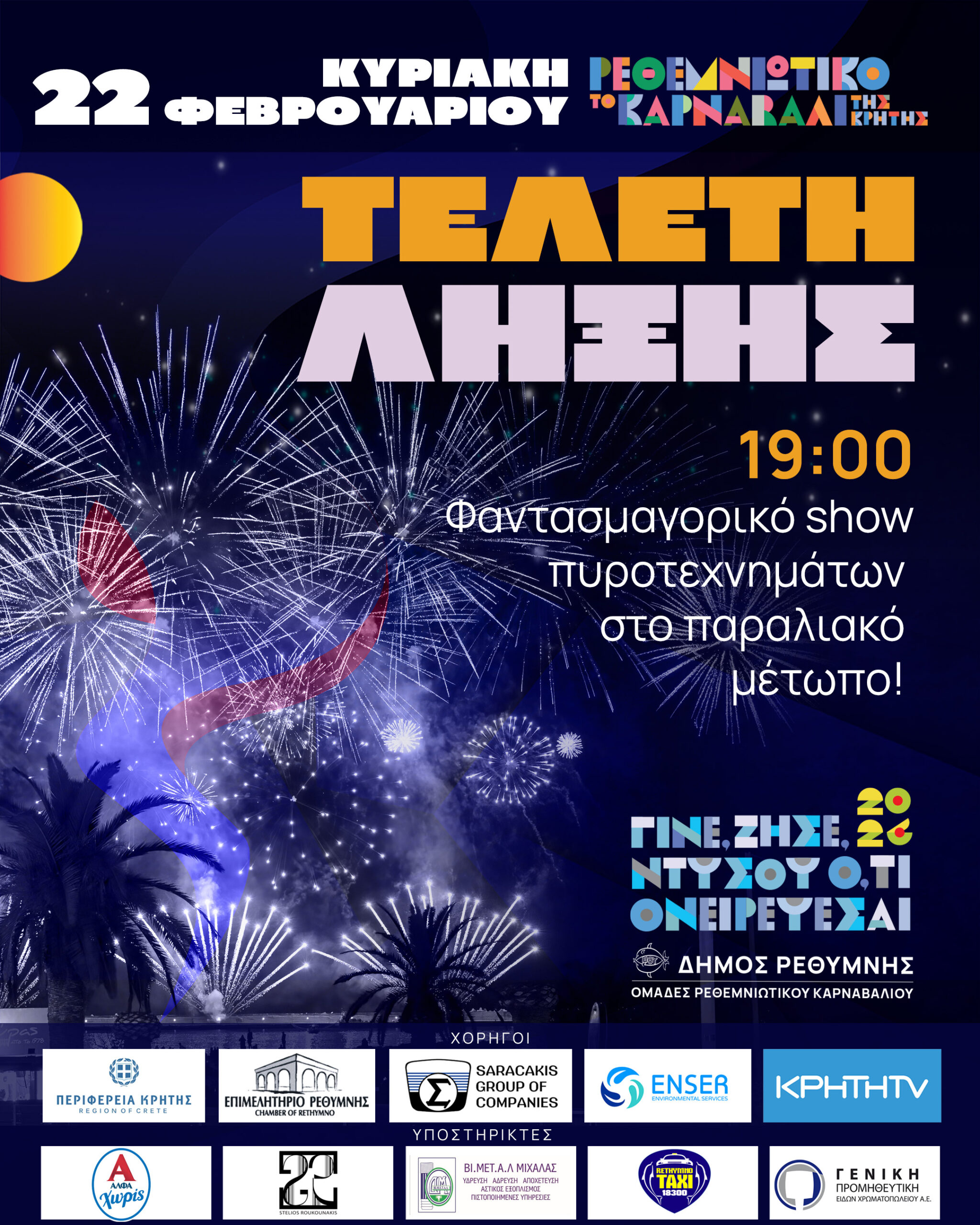 Το Ρέθυμνο, μια πόλη ασφαλής, άψογα προετοιμασμένη, ζει την κορύφωση του Ρεθεμνιώτικου Καρναβαλιού ’26 και το πρόγραμμα των μεγάλων εκδηλώσεων έχει ως ακολούθως: