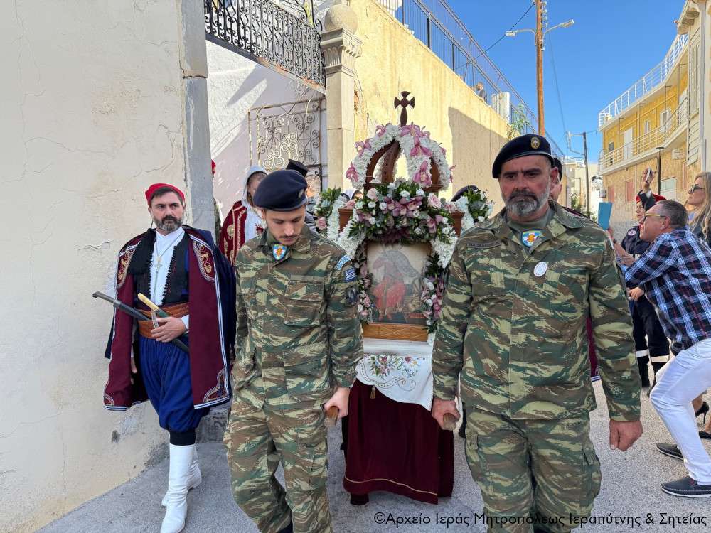 Στη λιτανευτική πομπή για την περιφορά της ιεράς εικόνας και των ιερών λειψάνων, που συνόδευσαν στρατιώτες του Τάγματος Εθνοφυλακής Νομού Λασιθίου και εθελοντές της Ε.Δ.Ε.Α.Κ. Σητείας καθώς και Μέλη των Σχολών Παραδοσιακών Χορών «ΚΡΗΤΩΝ ΡΙΖΕΣ» και Ευαγγελίας Βεζυράκη, προεξήρχαν οι Σεβ/τοι Μητροπολίτες Ιεραπύτνης και Σητείας κ. Κύριλλος και Ρεθύμνης και Αυλοποτάμου κ. Πρόδρομος, περιστοιχούμενοι από τον Ιερό Κλήρο,