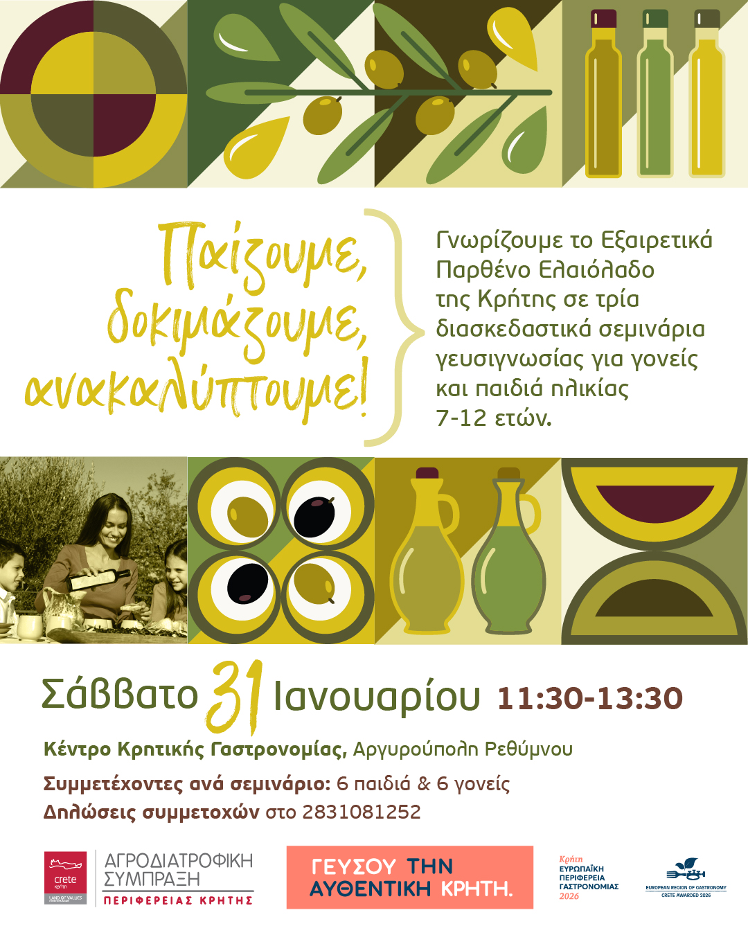 Στο πλαίσιο του 12ου Παγκρήτιου Διαγωνισμού Ελαιόλαδου και με αφορμή την ανάδειξη της Κρήτης ως Ευρωπαϊκή Γαστρονομική Περιφέρεια 2026, το Κέντρο Κρητικής Γαστρονομίας μεταμορφώνεται σε έναν χώρο εξερεύνησης, παιχνιδιού και γεύσης.