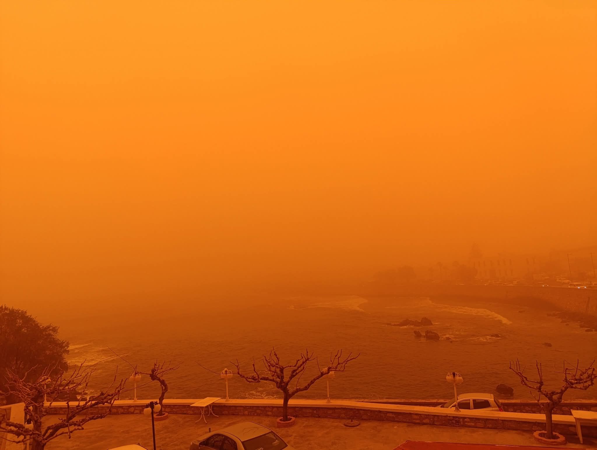 Από το μεσημέρι έως και τις απογευματινές ώρες, η εικόνα του ουρανού πάνω από το νησί μεταβαλλόταν διαρκώς, από κιτρινωπές αποχρώσεις σε έντονο πορτοκαλί και, σε αρκετές περιπτώσεις, σε βαθύ κόκκινο. Το σκηνικό που διαμορφώθηκε χαρακτηρίστηκε από πολλούς πρωτόγνωρο, ενώ δεν έλειψαν και οι έντονες αντιδράσεις λόγω της πυκνότητας της σκόνης και της δυσκολίας στην αναπνοή.