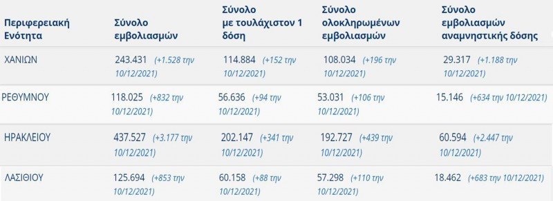Στα Χανιά έχουν πραγματοποιηθεί συνολικά 108.034 πλήρεις εμβολιασμοί, στο Ρέθυμνο 53.031, στο Ηράκλειο 192.727 και στο Λασίθι 57.298.