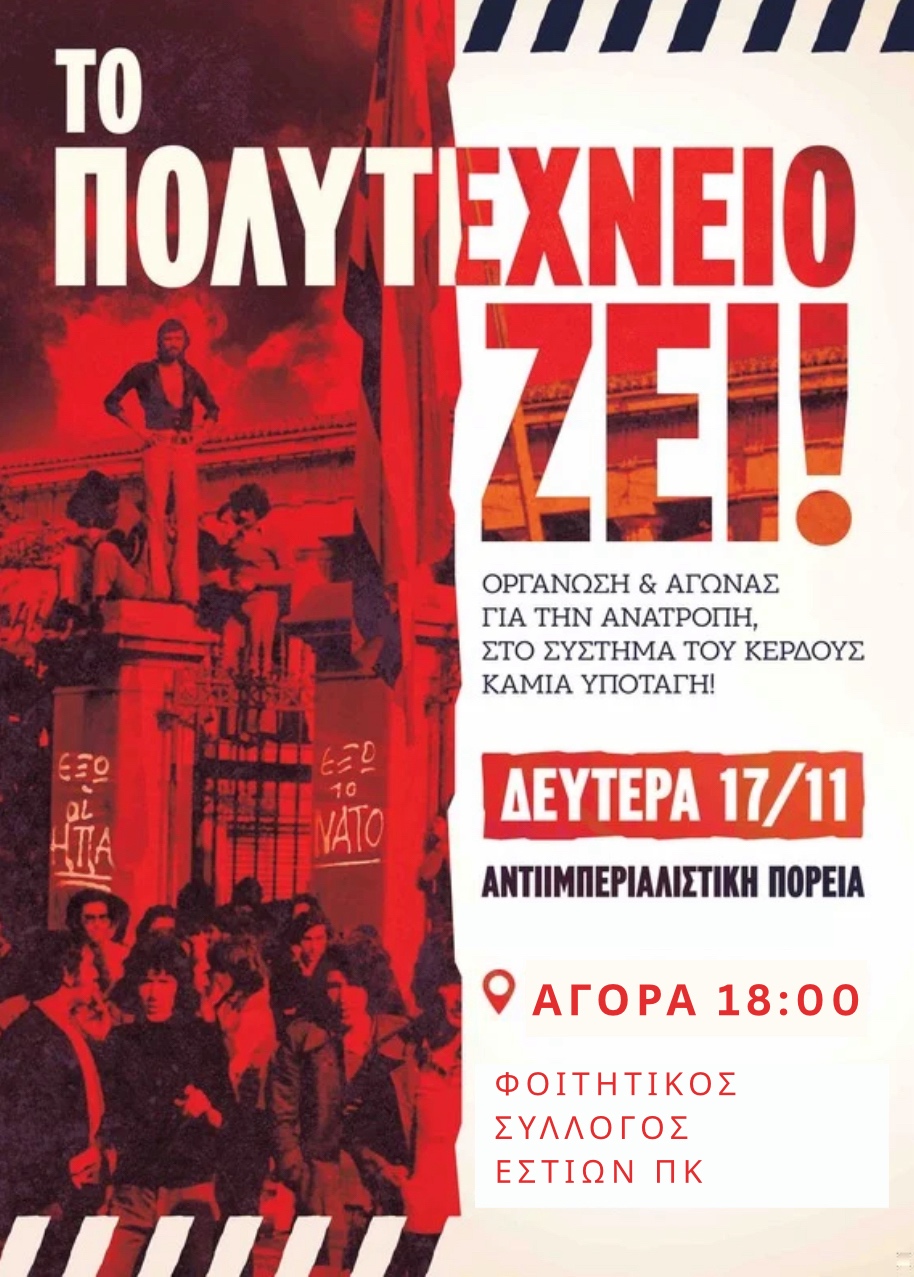 ➢ Οργανώνουμε τον 3ήμερο εορτασμό της επετείου του ξεσηκωμού του πολυτεχνείου, συμμετέχουμε μαζικά στην Αντιιμπεριαλιστική πορεία τη Δευτέρα 17 Νοέμβρη στις 18:00 στην πλ. Δημοτικής Αγοράς.