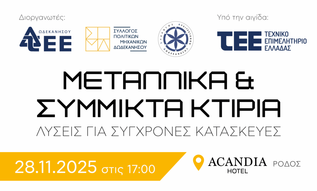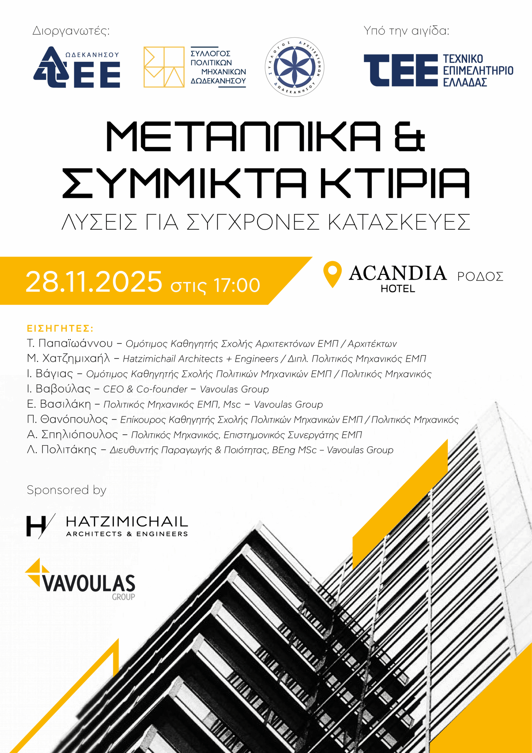 Στο πλαίσιο της εσπερίδας που διοργανώνει το ΤΕΕ Δωδεκανήσου σε συνεργασία με τον Σύλλογο Πολιτικών Μηχανικών Δωδεκανήσου και τον Σύλλογο Αρχιτεκτόνων Δωδεκανήσου, η οποία τελεί υπό την αιγίδα του Τεχνικού Επιμελητηρίου Ελλάδας (ΤΕΕ), οι εταιρείες Vavoulas Group [turn key construction] και Hatzimichail Architects + Engineers θα συμμετάσχουν με εξειδικευμένες εισηγήσεις και εταιρικές παρουσιάσεις, εστιάζοντας στην τεχνογνωσία και την καινοτομία στον τομέα των μεταλλικών και σύμμικτων κατασκευών.