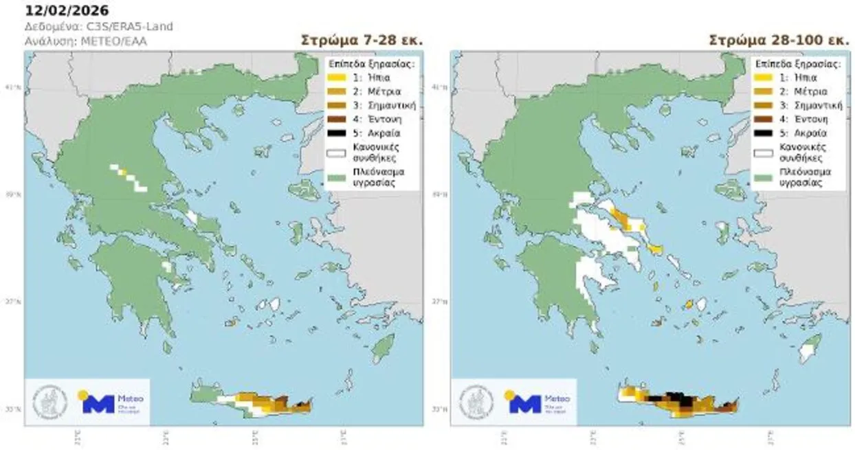 Εικόνα 1. Επίπεδα ξηρασίας στην Ελλάδα κατά την 12η Φεβρουαρίου 2026 στα στρώματα υπεδάφους 7-28 εκ. (αριστερά) και 28-100 εκ. (δεξιά). Οι περιοχές που βρίσκονται σε κατάσταση σχετικής ξηρασίας είναι χρωματισμένες σύμφωνα με την 5-βάθμια κλίμακα στο άνω δεξιά άκρο του χάρτη. Περιοχές όπου η εδαφική υγρασία είναι σημαντικά πάνω από τα κανονικά για την εποχή επίπεδα απεικονίζονται με πράσινο, ενώ περιοχές με εδαφική υγρασία κοντά στην μέση τιμή απεικονίζονται με άσπρο.