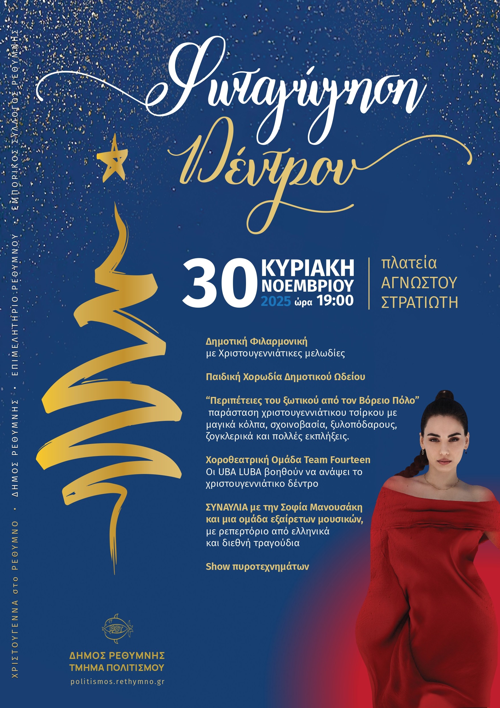 «Με μια γιορτή που θα την πλημμυρίζουν τα πολύχρωμα φώτα, η μουσική, τα τραγούδια και τα εορταστικά δρώμενα, το Ρέθυμνο θα μπει στην φαντασμαγορία των ημερών καλώντας μικρούς και μεγάλους να χαρούν στην πόλη μας ανεπανάληπτες γιορτές» όπως επισημαίνει ο Αντιδήμαρχος Πολιτισμού Δήμου Ρεθύμνης κ. Μάνος Τσακωνας, ο οποίος με τους συνεργάτες του έχουν ετοιμάσει ένα πλούσιο πρόγραμμα εκδηλώσεων.