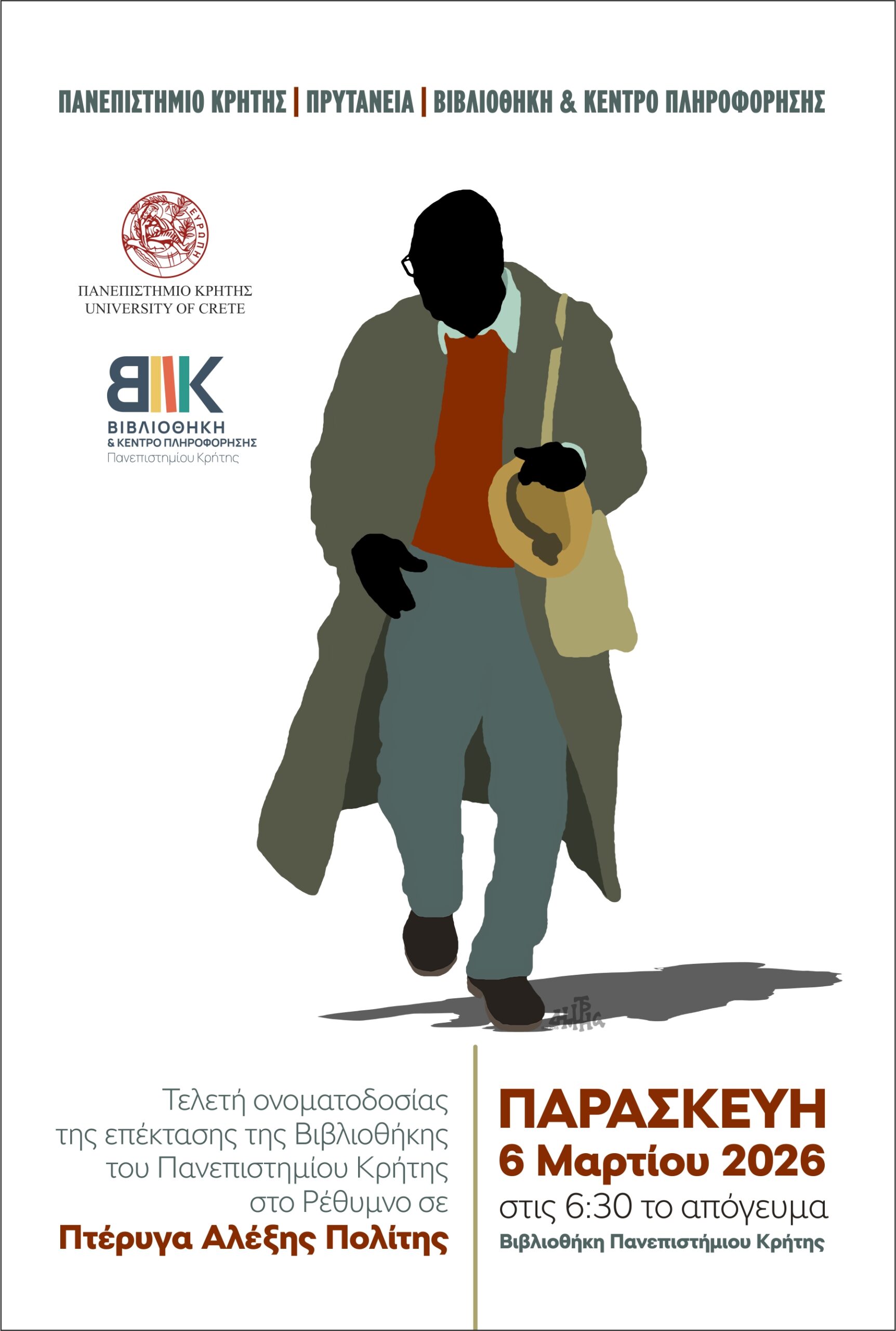 Το Πανεπιστήμιο Κρήτης τιμά τη μνήμη του Αλέξη Πολίτη, ονομάζοντας τη νέα πτέρυγα της Βιβλιοθήκης στο Ρέθυμνο πτέρυγα «Αλέξης Πολίτης». Η τελετή θα πραγματοποιηθεί την Παρασκευή 6 Μαρτίου 2026, στις 6.30 το απόγευμα.
