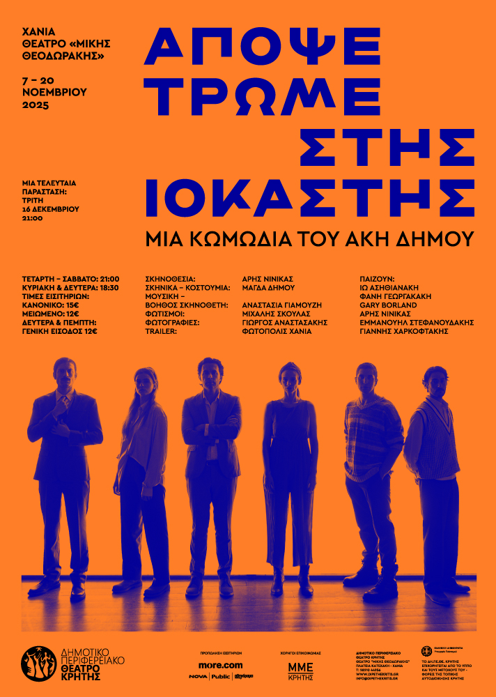 Το Δημοτικό Περιφερειακό Θέατρο Κρήτης παρουσιάζει την εκρηκτική κωμωδία του Άκη Δήμου «Απόψε τρώμε στης Ιοκάστης» σε σκηνοθεσία Άρη Νινίκα. Πρόκειται για ένα από τα κορυφαία έργα της σύγχρονης ελληνικής δραματουργίας, το οποίο θα κάνει πρεμιέρα στα Χανιά, στο θέατρο «Μίκης Θεοδωράκης» στις 7 Νοεμβρίου και στη συνέχεια θα περιοδεύσει σε όλη την Κρήτη.