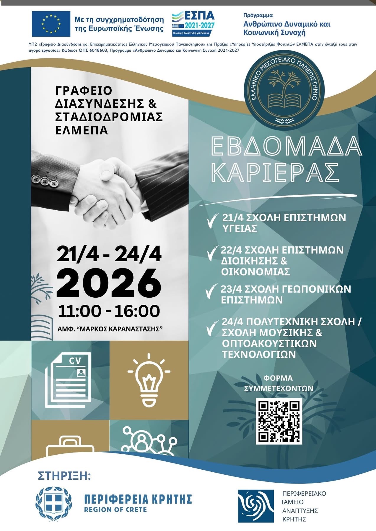 Το Γραφείο Διασύνδεσης και Σταδιοδρομίας του Ελληνικού Μεσογειακού Πανεπιστημίου (ΕΛΜΕΠΑ), σε συνεργασία με τα Ακαδημαϊκά Τμήματα και τις Σχολές του Ιδρύματος, προσκαλεί φοιτητές, φοιτήτριες και αποφοίτους στην Εβδομάδα Καριέρας ΕΛΜΕΠΑ 2026, μια σημαντική πρωτοβουλία που έχει στόχο να φέρει σε άμεση επαφή τη νέα γενιά επιστημόνων με επιχειρήσεις και οργανισμούς που δραστηριοποιούνται στους αντίστοιχους επαγγελματικούς κλάδους.