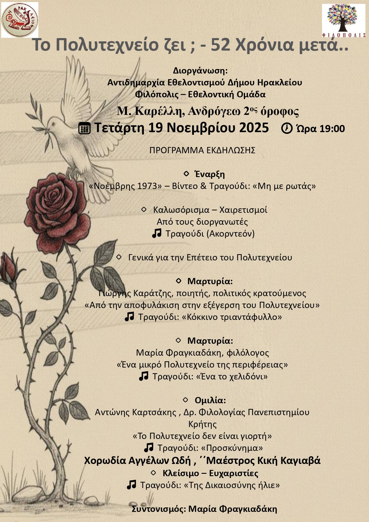 Ο συντονισμός της εκδήλωσης θα γίνει από την φιλόλογο Μαρία Φραγκιαδάκη και αποτελεί μια ευκαιρία αναστοχασμού πάνω στα ιδανικά της ελευθερίας, της Δημοκρατίας και της Κοινωνικής Δικαιοσύνης, που ενέπνευσαν το Πολυτεχνείο και εξακολουθούν να εμπνέουν τις νεότερες γενιές.