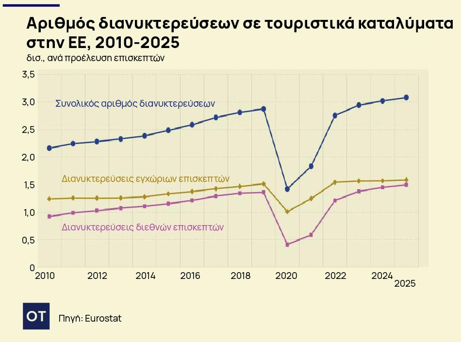 Το 2025, ο εκτιμώμενος αριθμός διανυκτερεύσεων σε τουριστικά καταλύματα στην ΕΕ έφτασε τα 3,08 δισεκατομμύρια, υπερβαίνοντας τον προηγούμενο χρόνο κατά 61,5 εκατομμύρια, ή 2 %, σύμφωνα με τα στοιχεία που έδωσε στη δημοσιότητα η ευρωπαϊκή στατιστική υπηρεσία Eurostat.