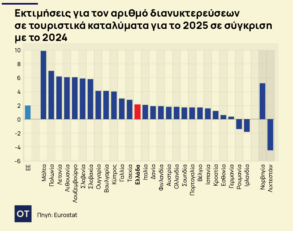 Σε σύγκριση με το 2024, το 2025 ο αριθμός των διανυκτερεύσεων σε τουριστικά καταλύματα αυξήθηκε σε όλες σχεδόν τις χώρες της ΕΕ. Η μεγαλύτερη αύξηση καταγράφηκε στη Μάλτα (+10 %), την Πολωνία (+7 %) και τη Λετονία (+6 %). Ελαφρά μείωση καταγράφηκε στη Ρουμανία (-1 %) και την Ιρλανδία (-2 %).