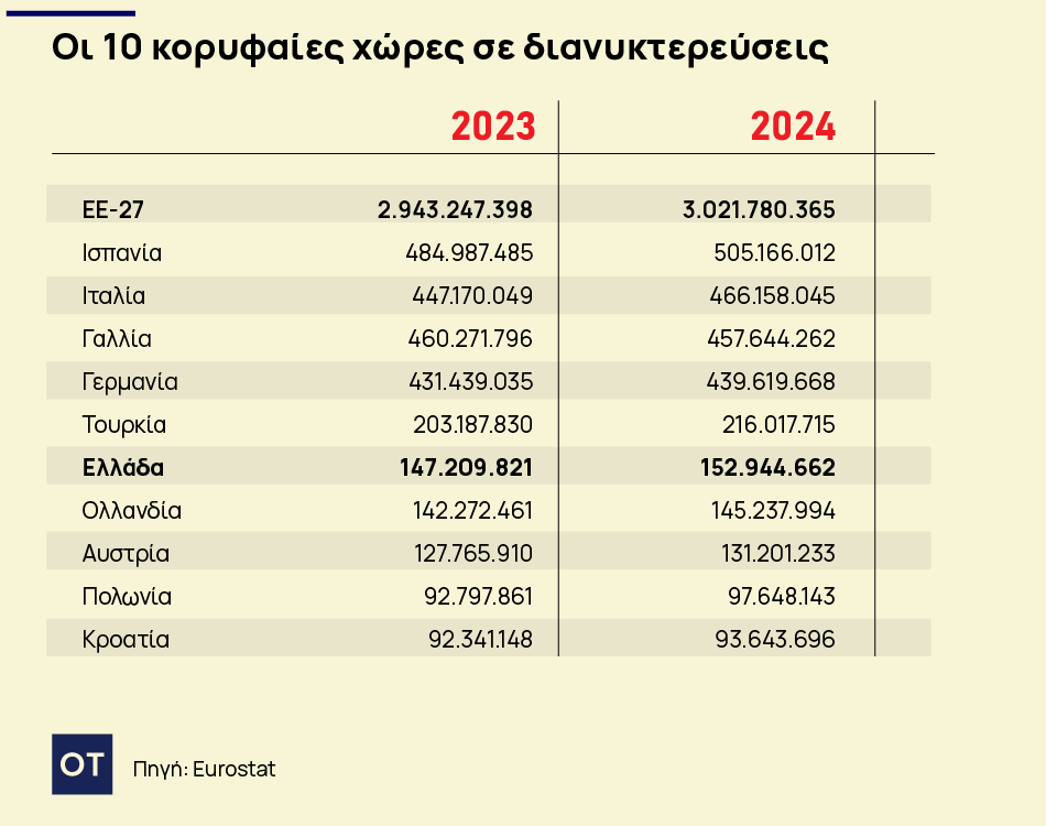 Η Ελλάδα κατατάχτηκε στην έκτη θέση των ευρωπαϊκών χωρών με 152.944.662 διανυκτερεύσεις το 2024 ενώ έναν χρόνο πριν (2023) είχε καταγράψει 147.209.821 διανυκτερεύσεις.