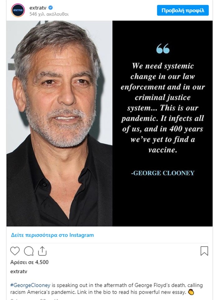 Πρόσφατα ο Τζορτζ Κλούνει, με μια επιστολή κόλαφο που δημοσιεύτηκε στο The Daily Beast, κάνει λόγο για «δολοφονία» και αναφέρεται στον ρατσισμό σαν πανδημία. «Ελάχιστες αμφιβολίες υπάρχουν ότι ο Τζορτζ Φλόιντ δολοφονήθηκε.