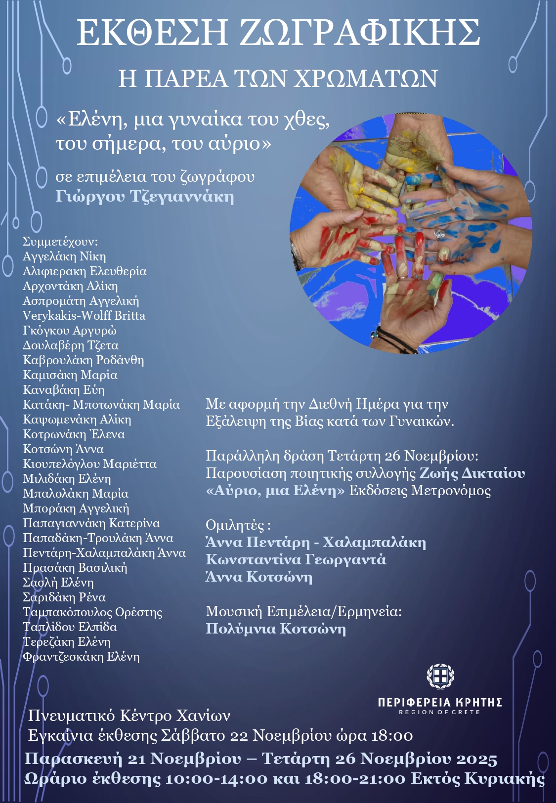 Η Περιφέρεια Κρήτης-Περιφερειακή Ενότητα Χανίων, το Πνευματικό Κέντρο Χανίων και οι Εκδόσεις Μετρονόμος, διοργανώνουν την έκθεση έργων της ζωγραφικής ομάδας “Η Παρέα των Χρωμάτων” με θέμα “Ελένη, μια γυναίκα του χθες, του σήμερα, του αύριο”, σε επιμέλεια του ζωγράφου Γιώργου Τζεγιαννάκη , με αφορμή τη Διεθνή Ημέρα για την Εξάλειψη της Βίας κατά των Γυναικών.